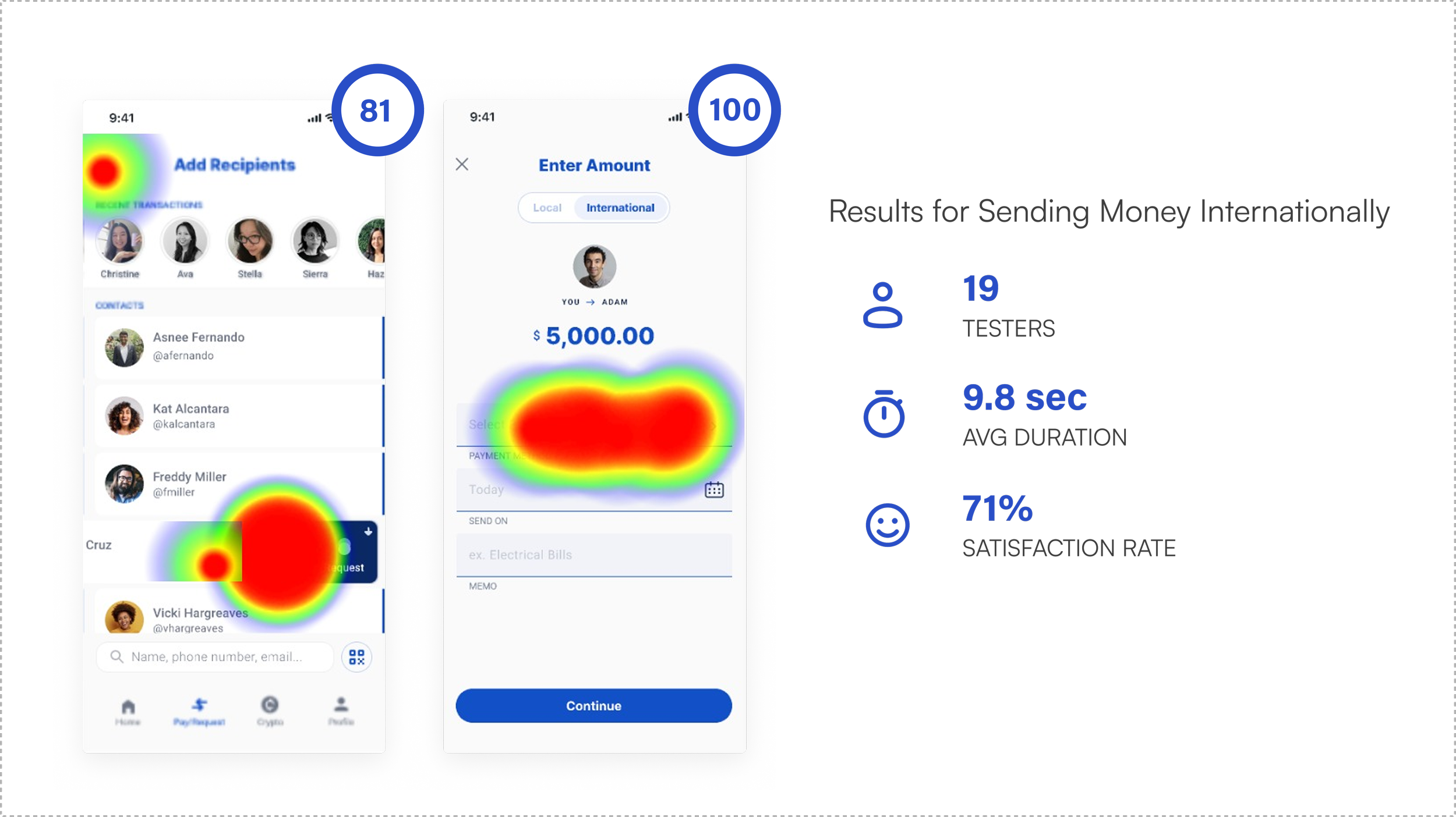 We conducted our final usability test on the high fidelity prototype and were able to find several important findings using Maze. This included usability scores, heat maps of the different screens, the average duration of the tasks, and the overall satisfaction rate. Our task results were based on a local flow and an international flow for the app, revealing the following information: