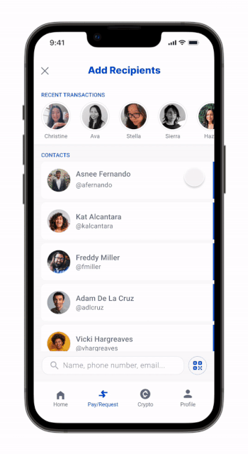 Inspired by social apps, the quick pay function is a way for users to resend money to those they have made recent transactions with. Additionally, the search bar was placed at the bottom of the screen for users to easily access the function.