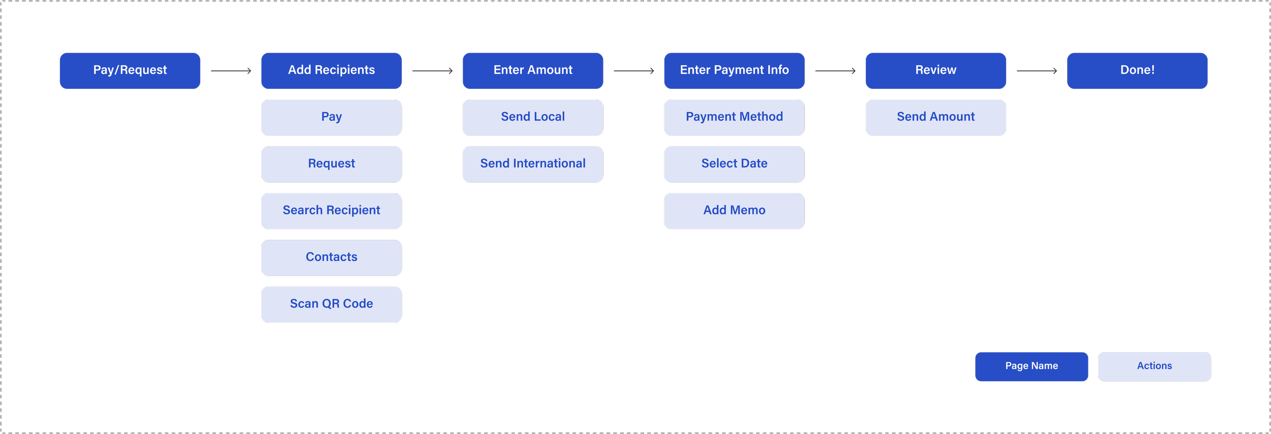 During our ideation phase, we brainstormed the different types of information as well as the steps users would need to take in order to successfully send and request money. By empathizing with users, we were able to create a user flow that would allow them to send money in the most convenient manner.