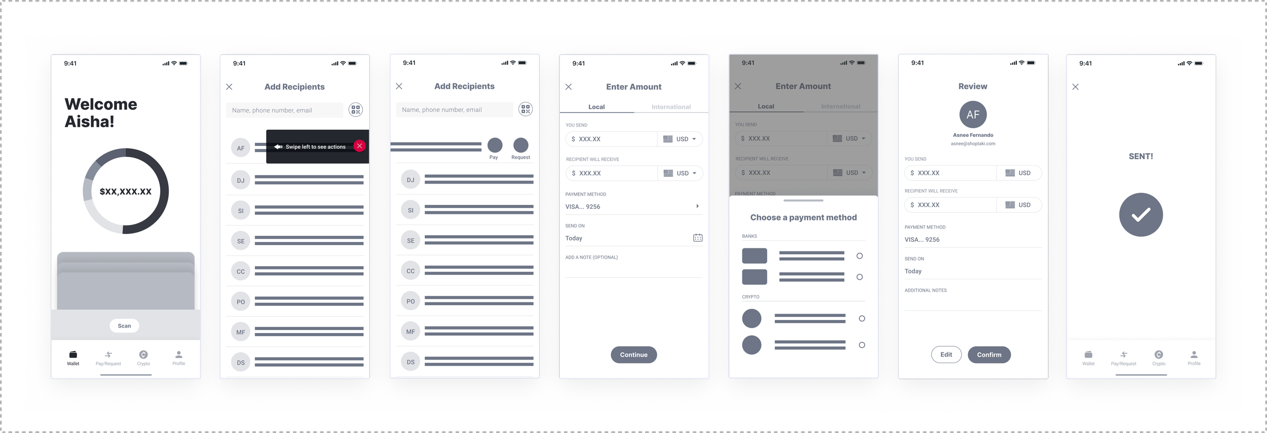 Using our competitive analysis results and our initial user flow, we designed mid-fidelity wireframes to show how users might send or request money through the app. The “Add Recipient” screen prompted users, using a tooltip, to swipe on a recipient of choice to start their pay/request flow.